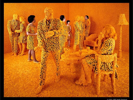 The repeated sculptures of dogs emerge strikingly through the image. Meanwhile, the furniture items resemble intricate topiaries that can act as small monuments to the middle-class home. A couple, a man and a woman, who appear more like a catalog advertisement, lounge by an unlit fireplace. These topics of American’s obsession with perfectly manicured lawns and the overwhelming love of dogs are examined with green turf acting as a bed for the dreamlike assortment of dogs. Even 20 years after the piece was created, these issues are still relevant, highlighting Skoglund’s adroitness at parodying cultural conventions.